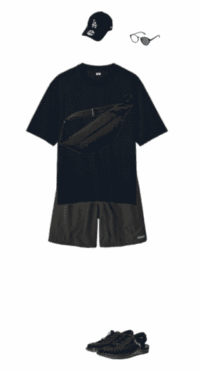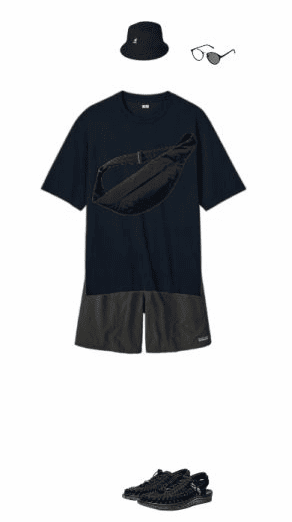 半袖Tシャツにショーツにサンダルと、どれもカジュアルなアイテムだからこそ、カラーは大人っぽい黒で揃える。